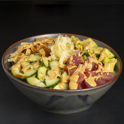Atún fresco en cubos sobre una base de arroz blanco, acompañado de aguacate, pepino, wonton strips, notas de jengibre y un toque de salsa de anguila y dynamite sauce, terminado con ajonjolí tostado.