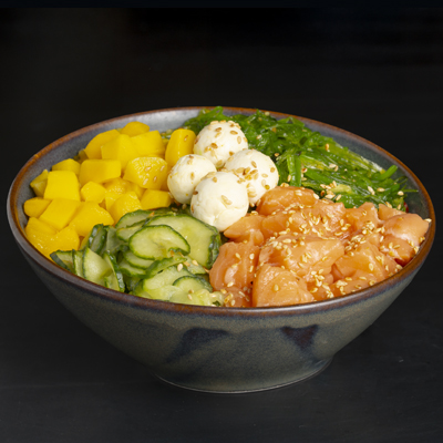 Salmón en cubos sobre una base de arroz blanco, acompañado de lechuga romana, wakame, pepino sunomono y mango, con un toque de queso crema y butter mango sauce, finalizado con ajonjolí tostado.