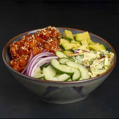 Pollo frito estilo coreano en Korean BBQ sauce sobre una base de arroz blanco, acompañado de col mix, pepino, aguacate y cebolla morada, con mayonesa japonesa y un toque final de ajonjolí tostado.