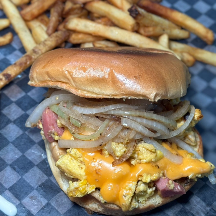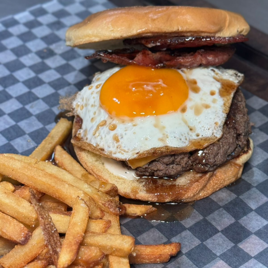 Pan brioche, carne de res, queso americano, tocino, queso estrellado y un huevo estrellado, acompañado de miel de maple y papas a la francesa