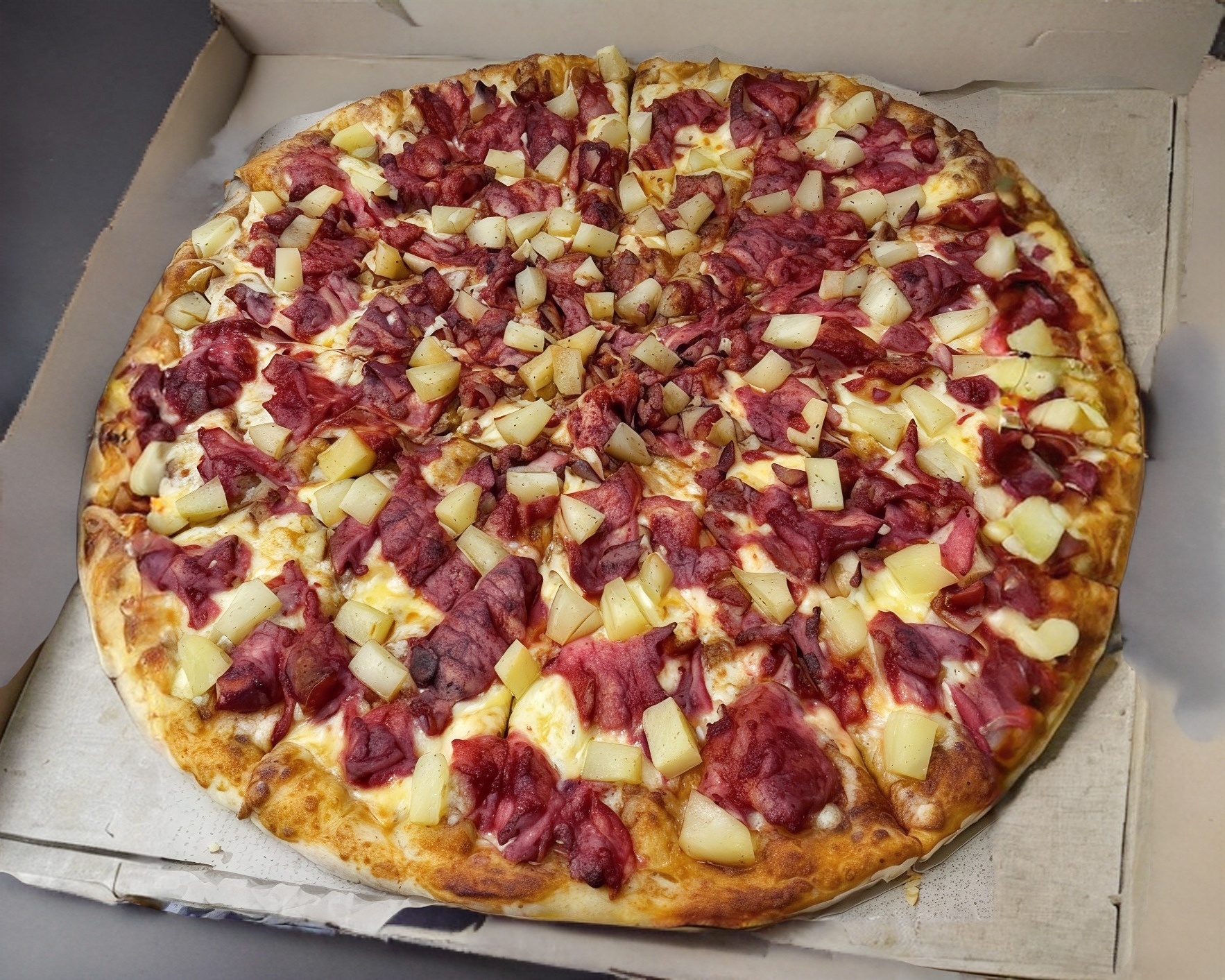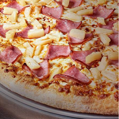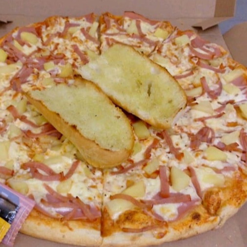 Pizza grande hawaiana, con pan de ajo más refresco de 1 L sujeto a disponibilidad.