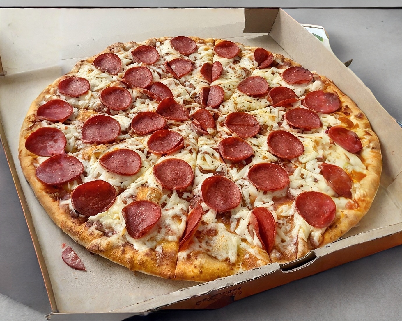 Pizza Grande 12 Rebanadas de Pepperoni, queso, salsa de tomate, sujeto a disponibilidad.