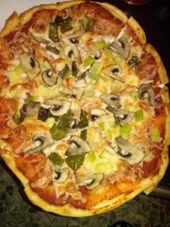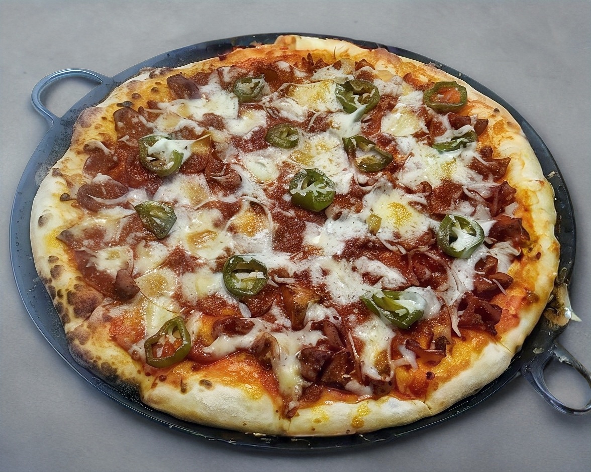 Pizza de Jamón, chorizo, jalapeño, queso y su salsa de tomate.