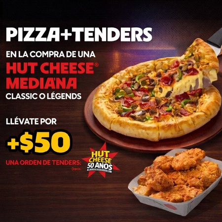 Hut Cheese Mediana de alguna de nuestras especialidades y más $50 llévate unos deliciosos Tenders