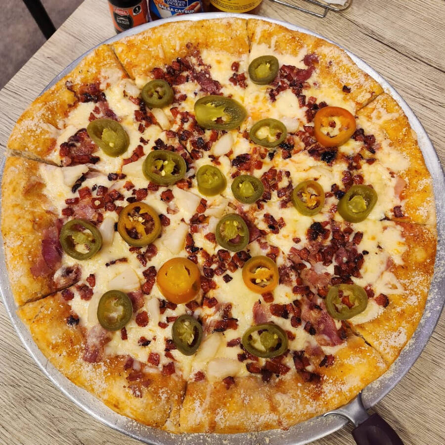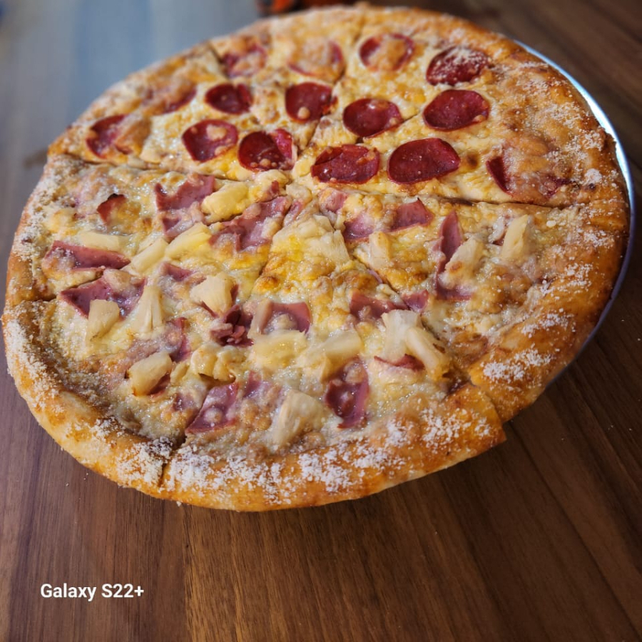 Mitad Peperoni, mitad jamón y piña
