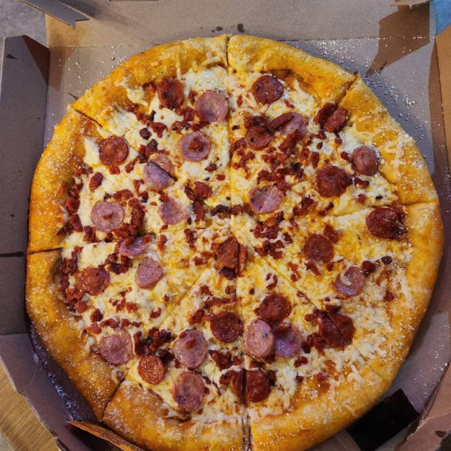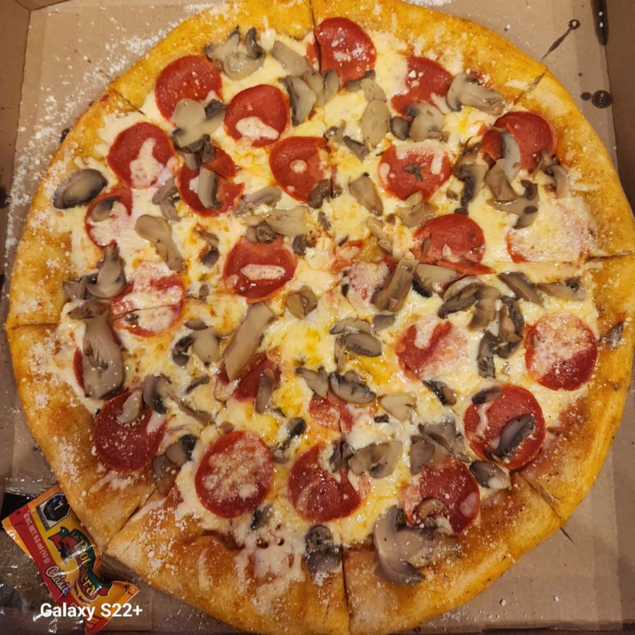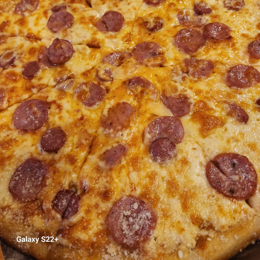 Pepperoni, salchicha de res, cebolla, pimiento verde y champiñones