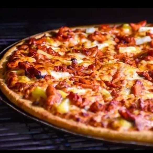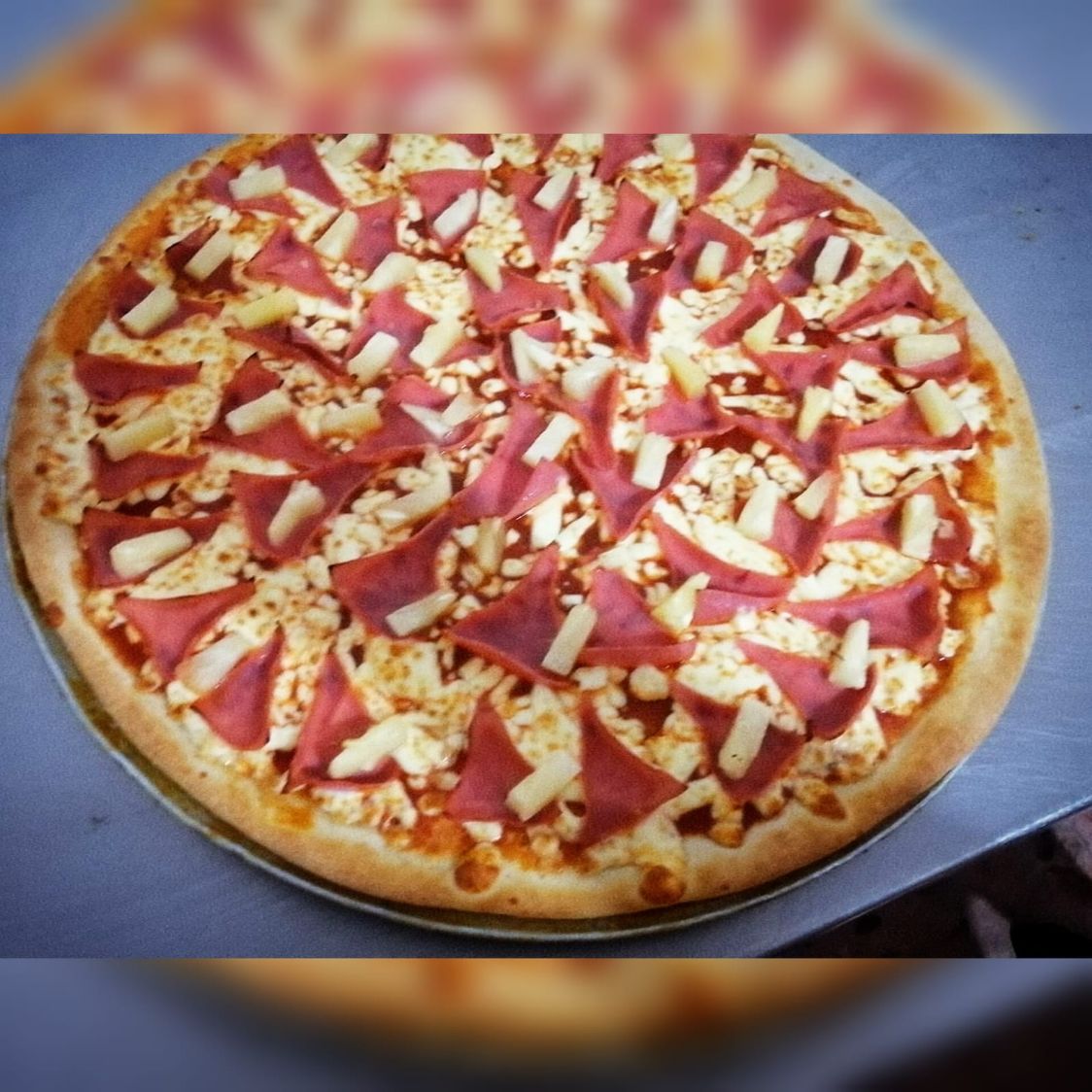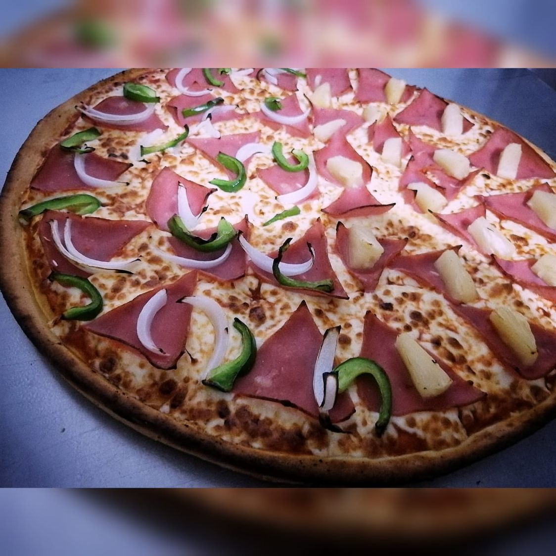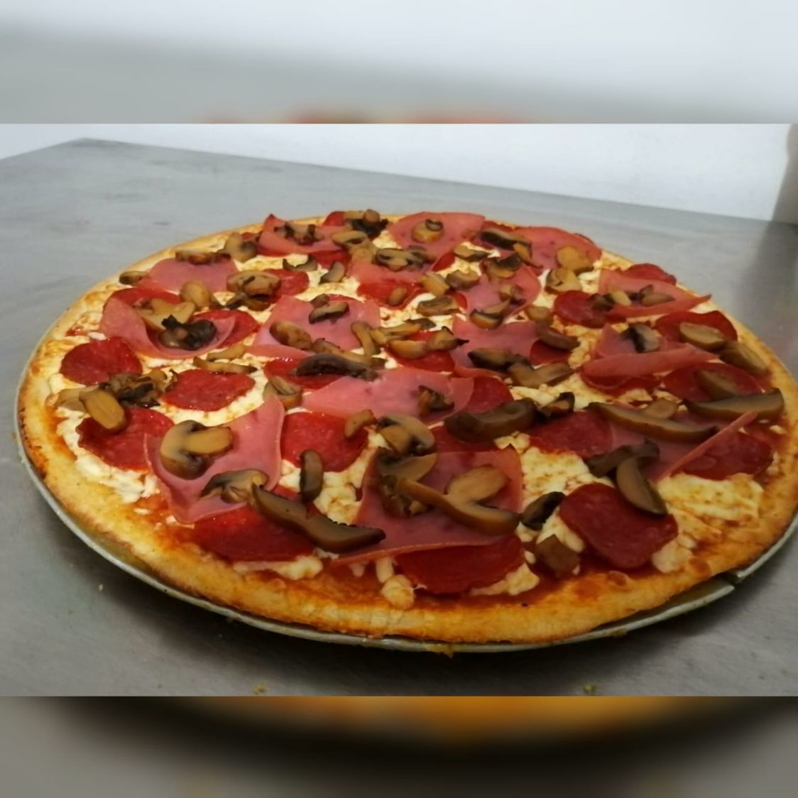 Pizza grande de jamón y salchicha de pavo con pan de ajo