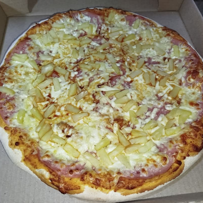 Pizza Grande de HAWAIANA JAMON PIÑA Nuestra clásica favorita: una pizza grande con masa artesanal doradita y suave, bañada en salsa de tomate casera y cubierta con abundante queso mozzarella fundido.