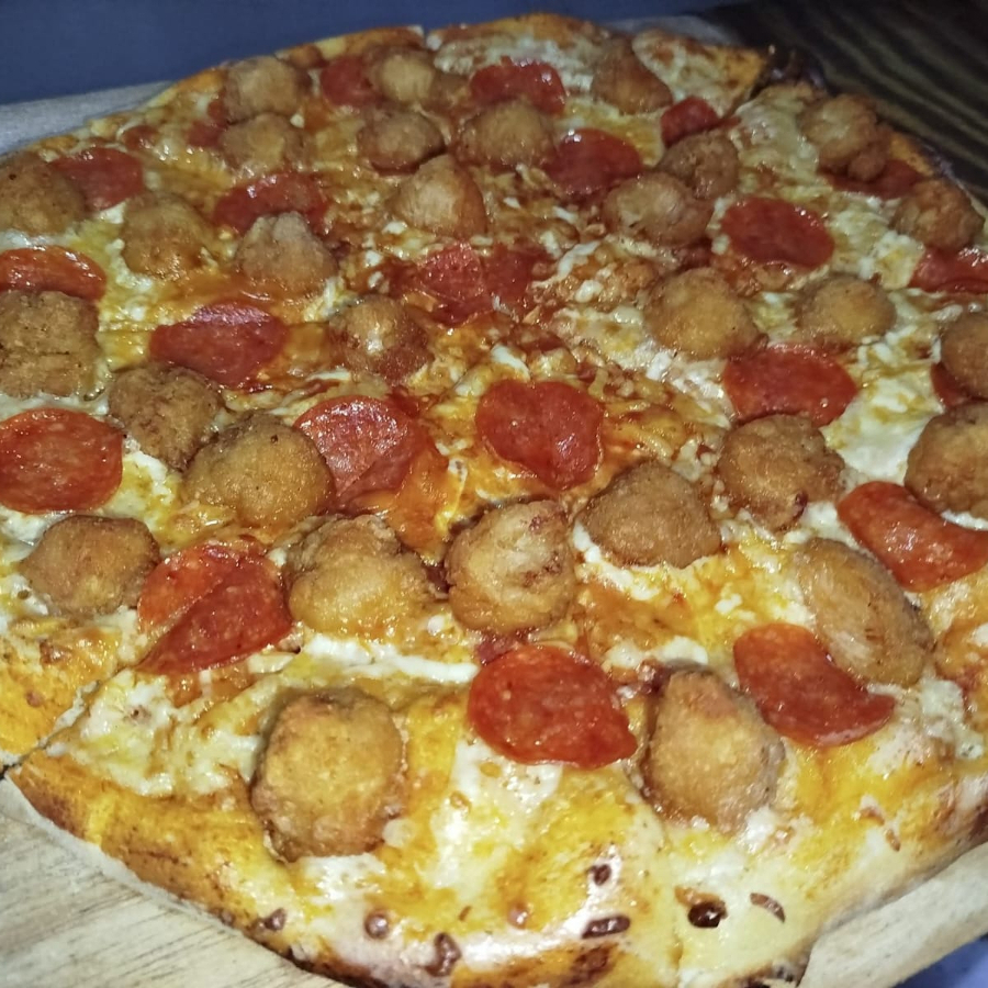 Pizza Grande 1/2 Boneles con peperoni c/salsa bufalo 1/2 Boneles con champiñón C/salsa bbq Nuestra clásica favorita: una pizza grande con masa artesanal doradita y suave, bañada en salsa de tomate casera y cubierta con abundante queso mozzarella fundido.