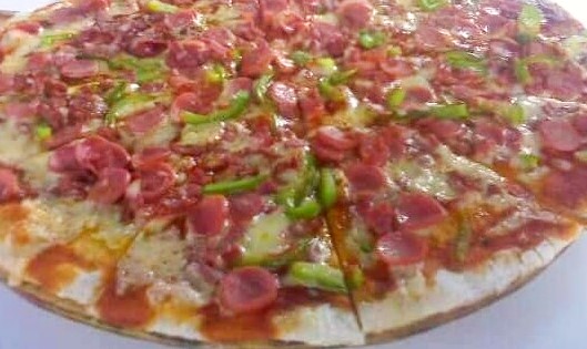 Jamón, salami, champiñón, tocino, pimiento, cebolla y chorizo