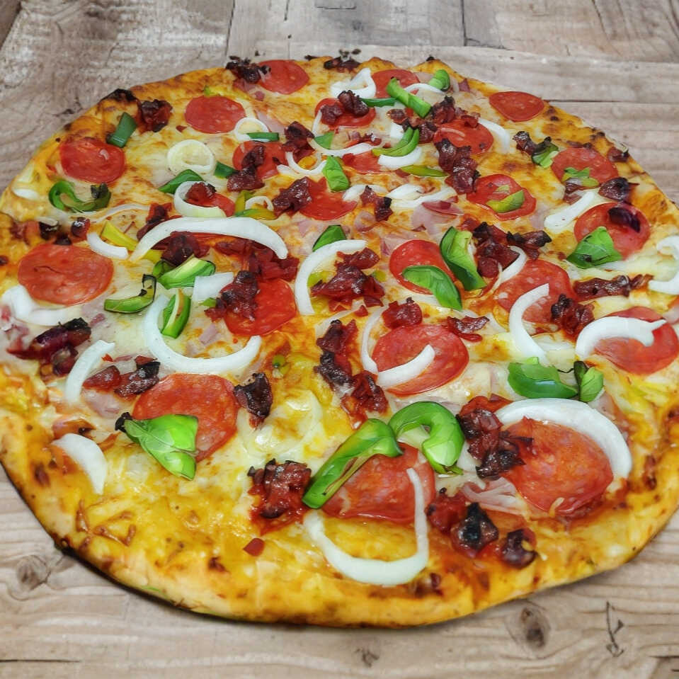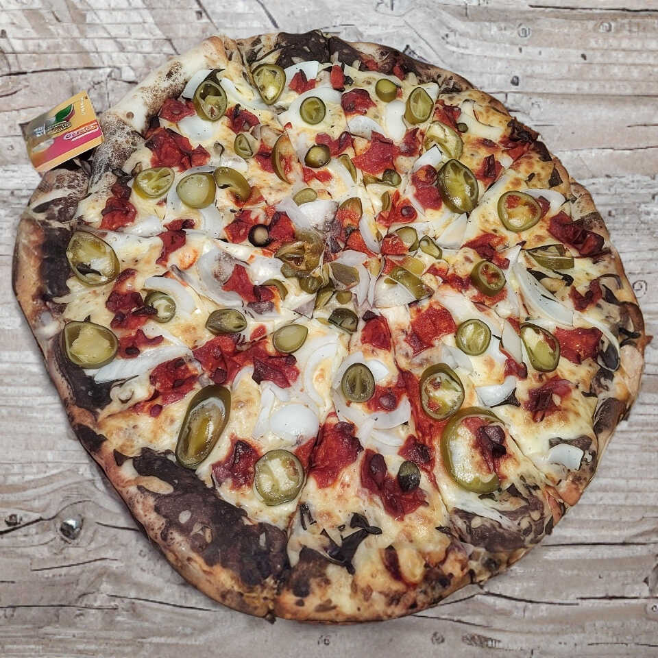 Salsa De Tomate,Jamon,Salami,Peperoni,Cebolla,Chorizo,Pimiento,Queso Manchego. Acompañado de su Salsa Inglesa,Oregano Y Su Chile Molido