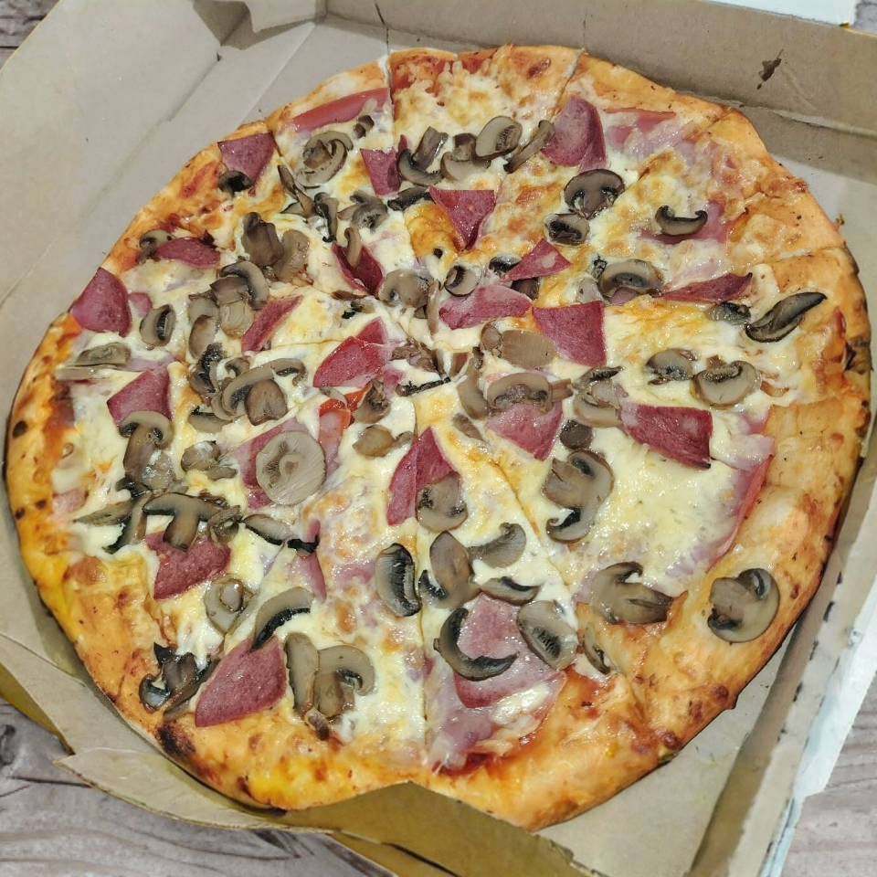 Salsa De Tomate,Queso Manchego,Jamon,Salami Y Champiñon.Acompañado De Su Salsa Inglesa,Oregano Y Su Chile Molido