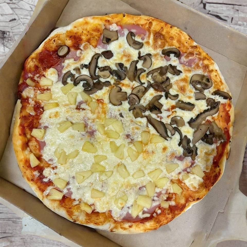 Pizza Mitad Hawaina Mitad Champiñon (Grande)