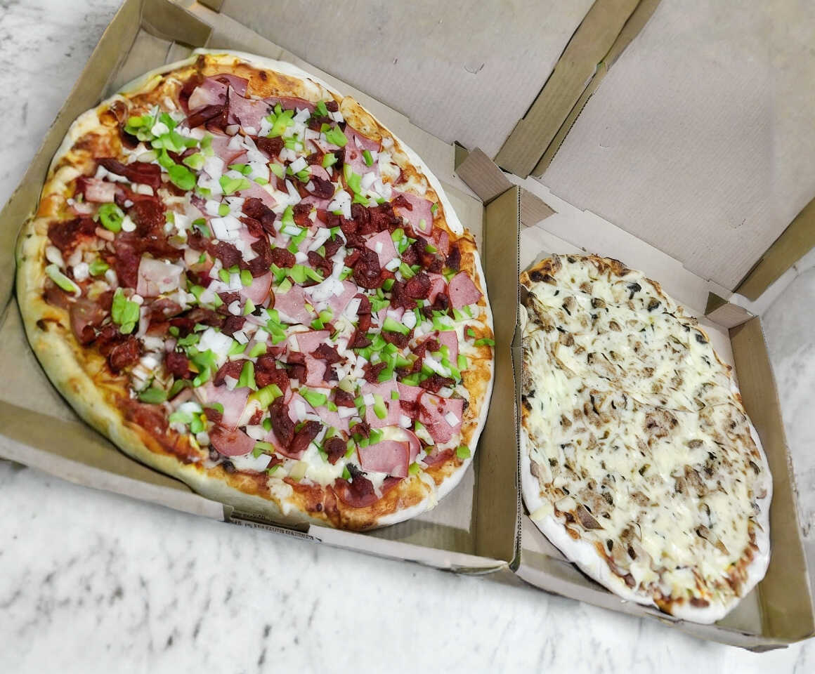Jamón, salami, tocino, chorizo, piña, champiñones, pimiento, cebolla y salchicha de pavo, pan con ajo