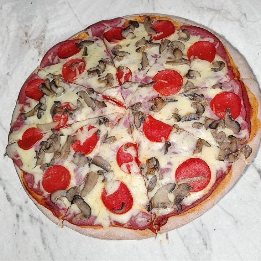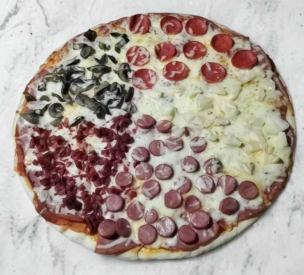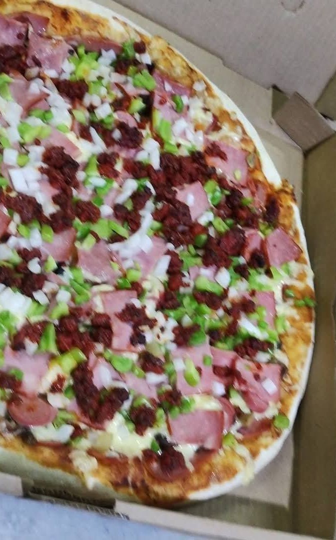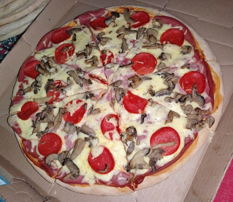 Jamón, champiñones, pimiento, cebolla, tocino y salchicha asadera
