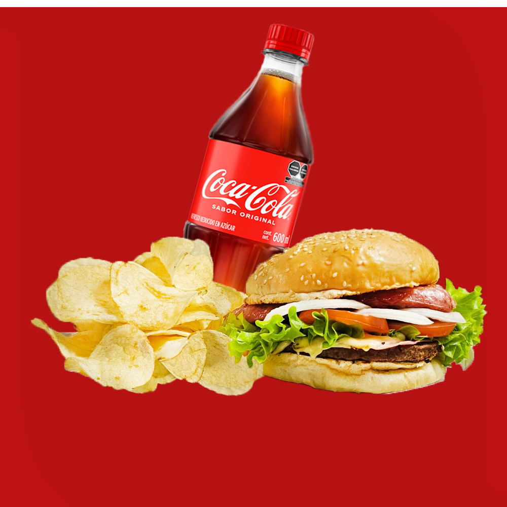 Un sabor que nos caracteriza - deliciosa hamburguesa Yucateca con carne de Sirloin a la plancha, jamón, queso derretido, lechuga, rodajas de cebolla, mayonesa, tomate y salsa de longaniza de la casa, servido sobre pan levemente tostado con semillas de ajonjolí, 1 ración de papas estilo chisps y 1 refresco a elegir.