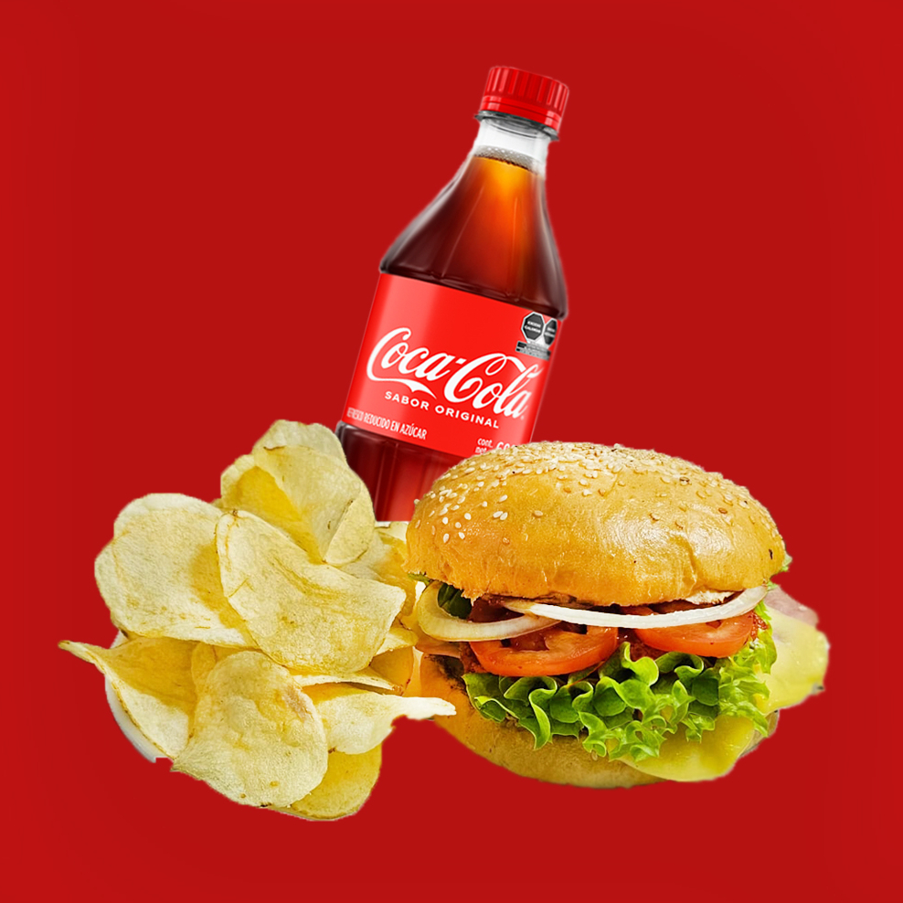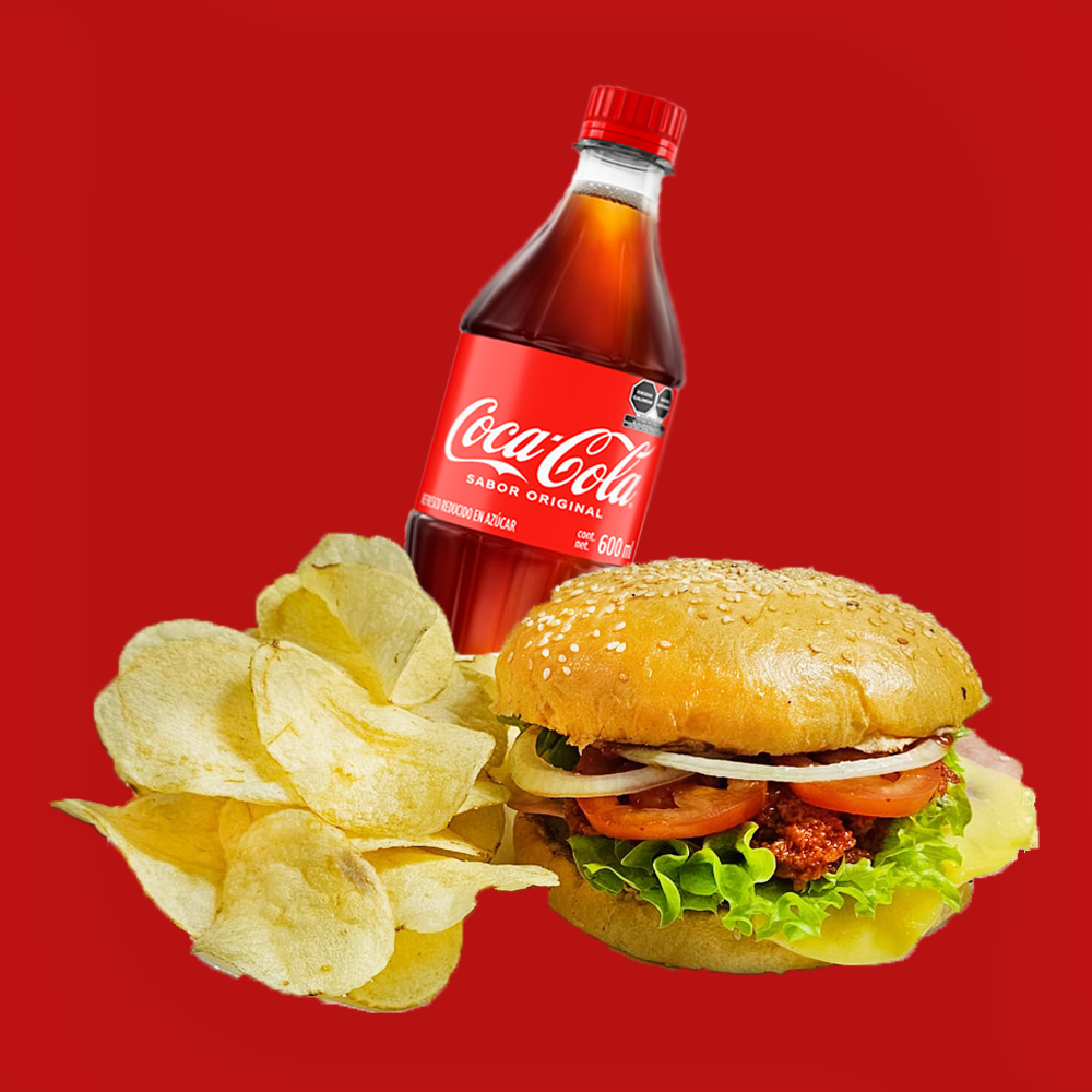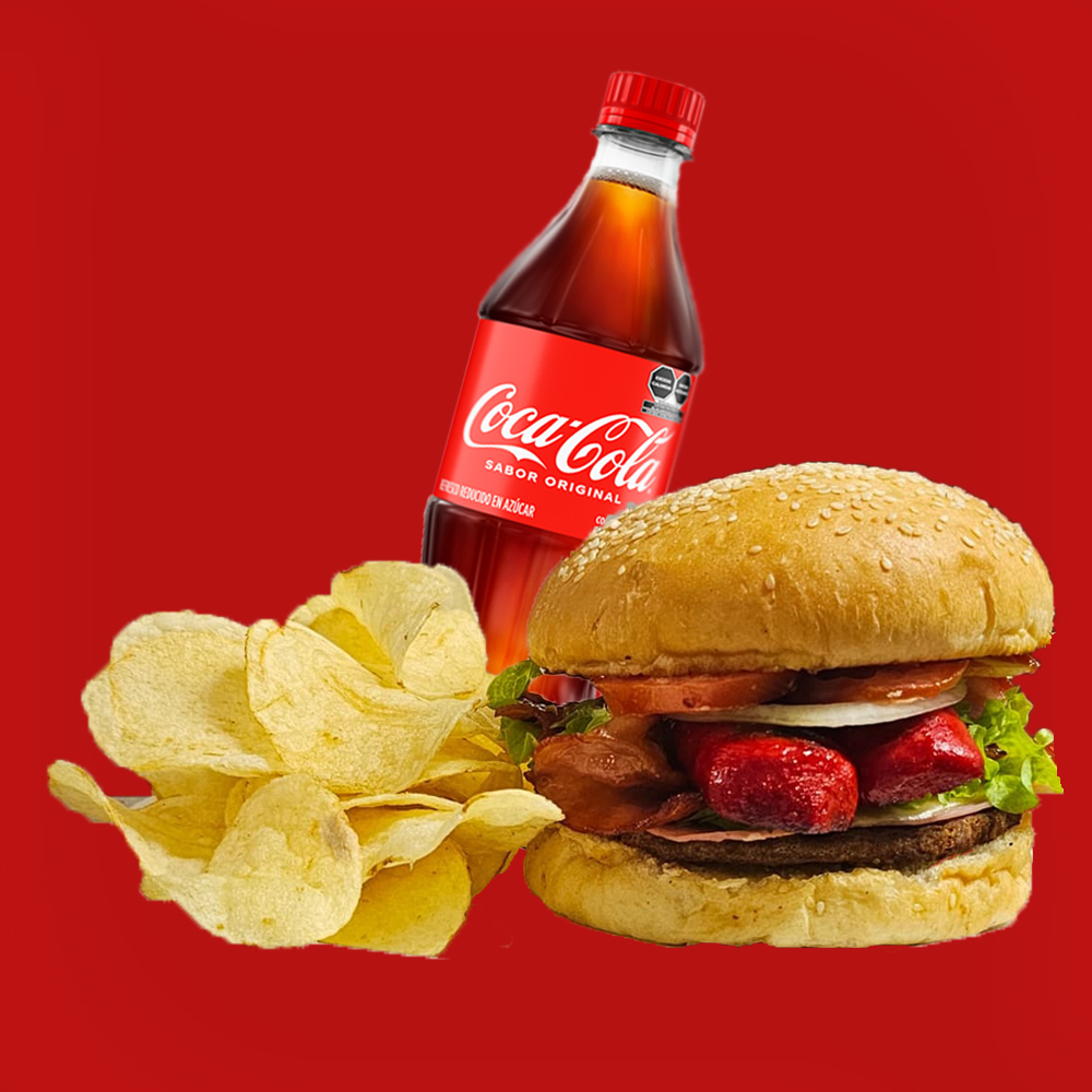 El estilo clásico nunca se olvida - deliciosa hamburguesa tradicional con carne de Sirloin a la plancha, jamón, queso derretido, lechuga, rodajas de cebolla, mayonesa y tomate, servido sobre pan levemente tostado con semillas de ajonjolí, 1 ración de papas estilo chisps y refresco a elegir