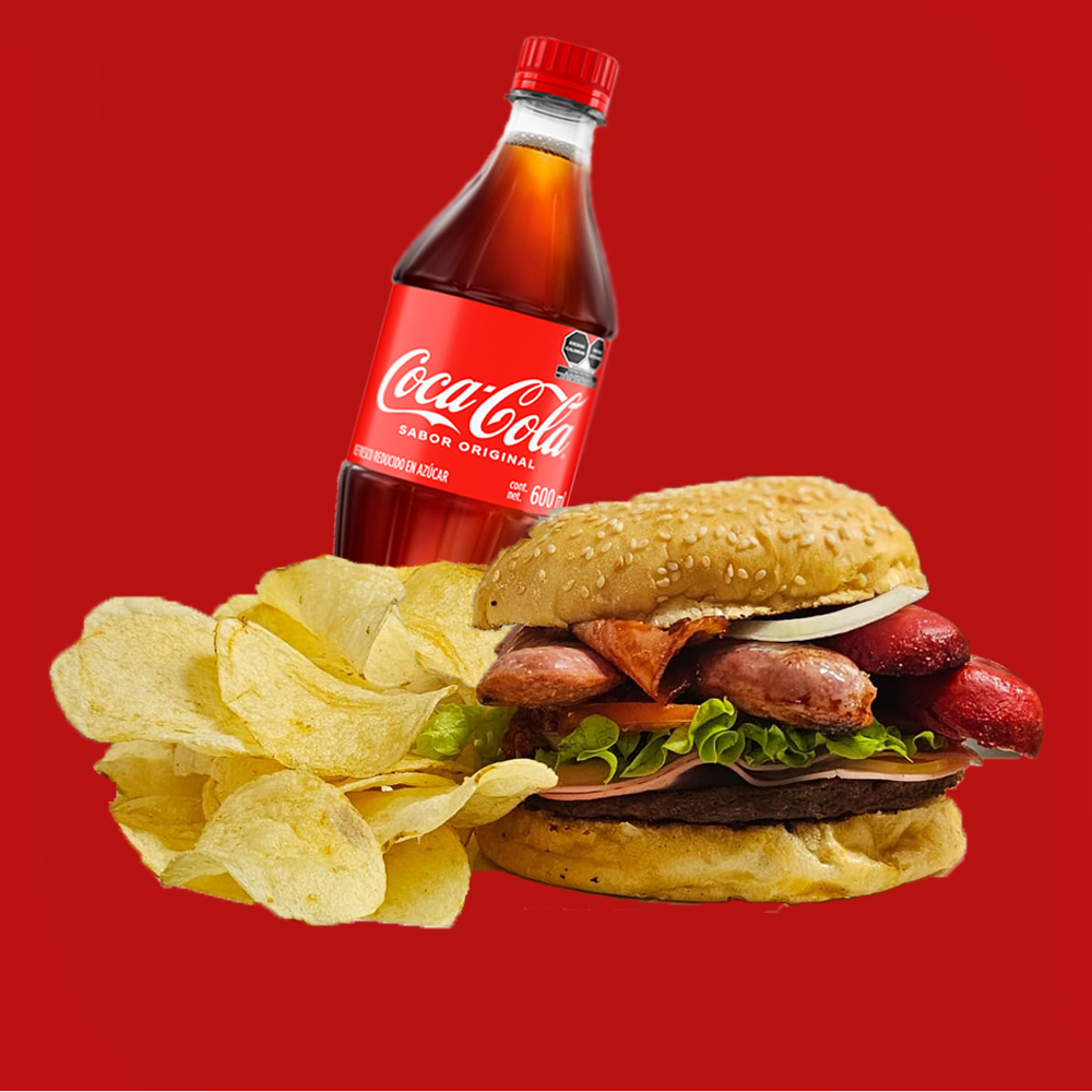 El sabor del chorizo argentino es muy bueno - deliciosa hamburguesa choricera con carne de Sirloin a la plancha, jamón, queso derretido, lechuga, rodajas de cebolla, mayonesa, tomate y chorizo argentino pasado a la plancha, servido sobre pan levemente tostado con semillas de ajonjolí, 1 ración de papas estilo chisps y 1 refresco a elegir.