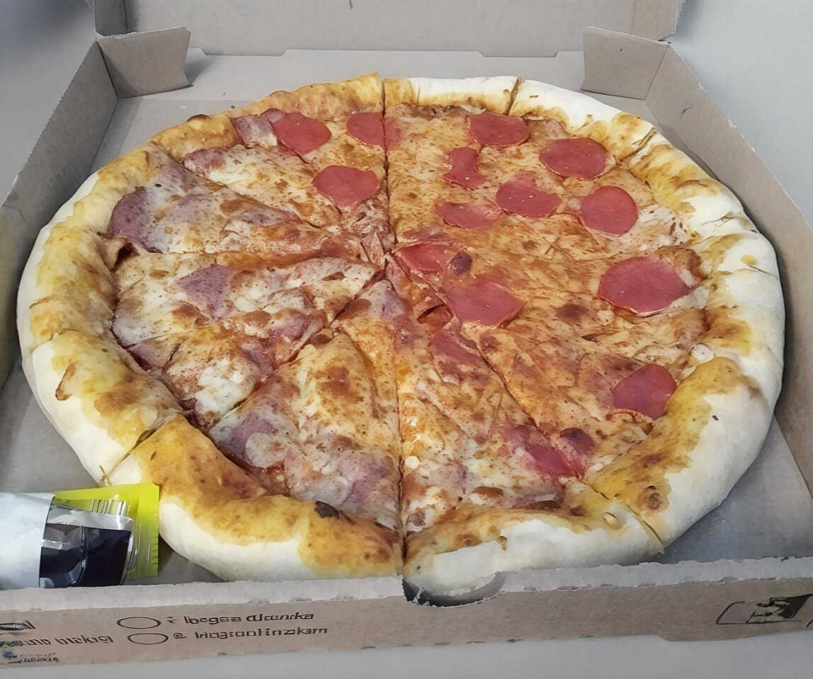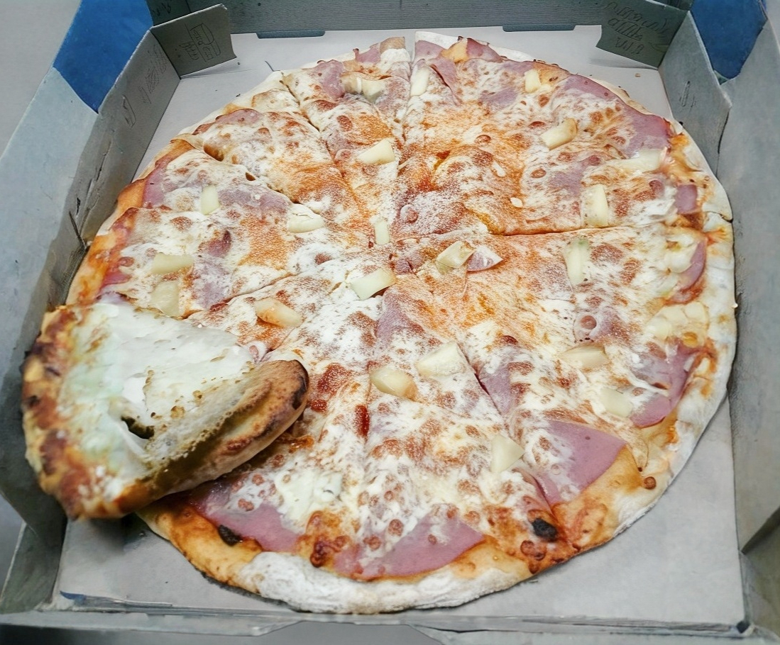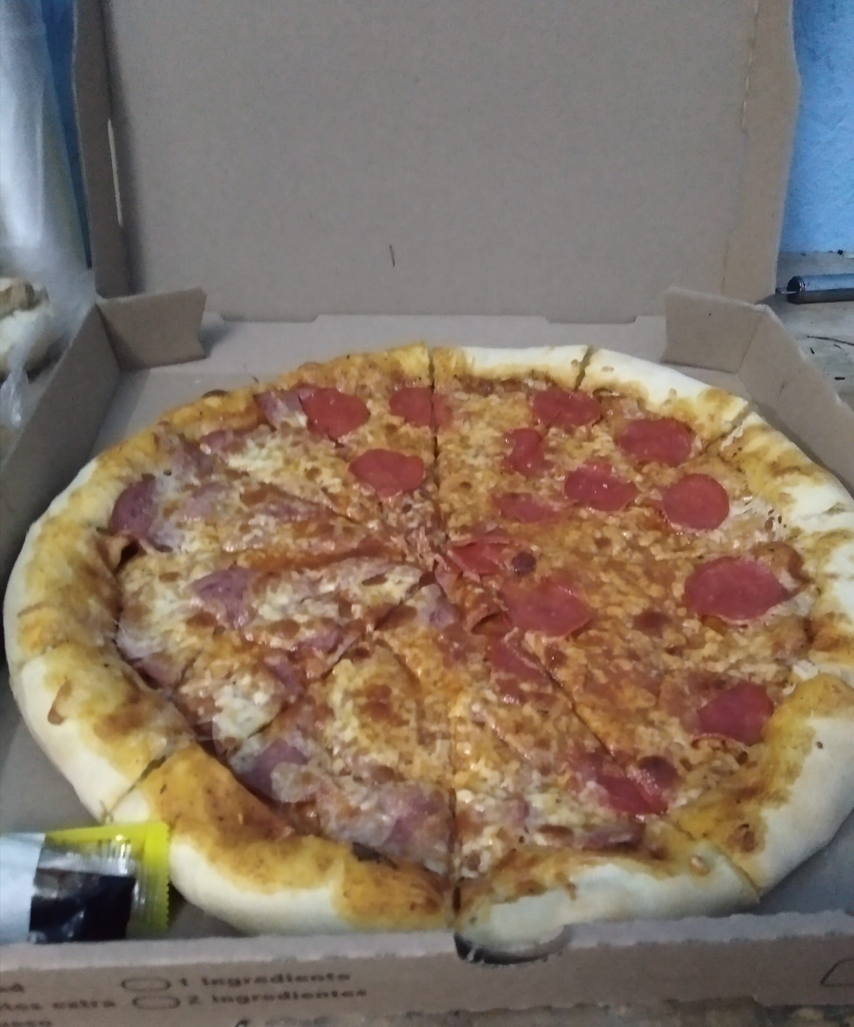 Pizza grande, dividida en 12 porciones. Elige 1 ingrediente de tu preferencia.