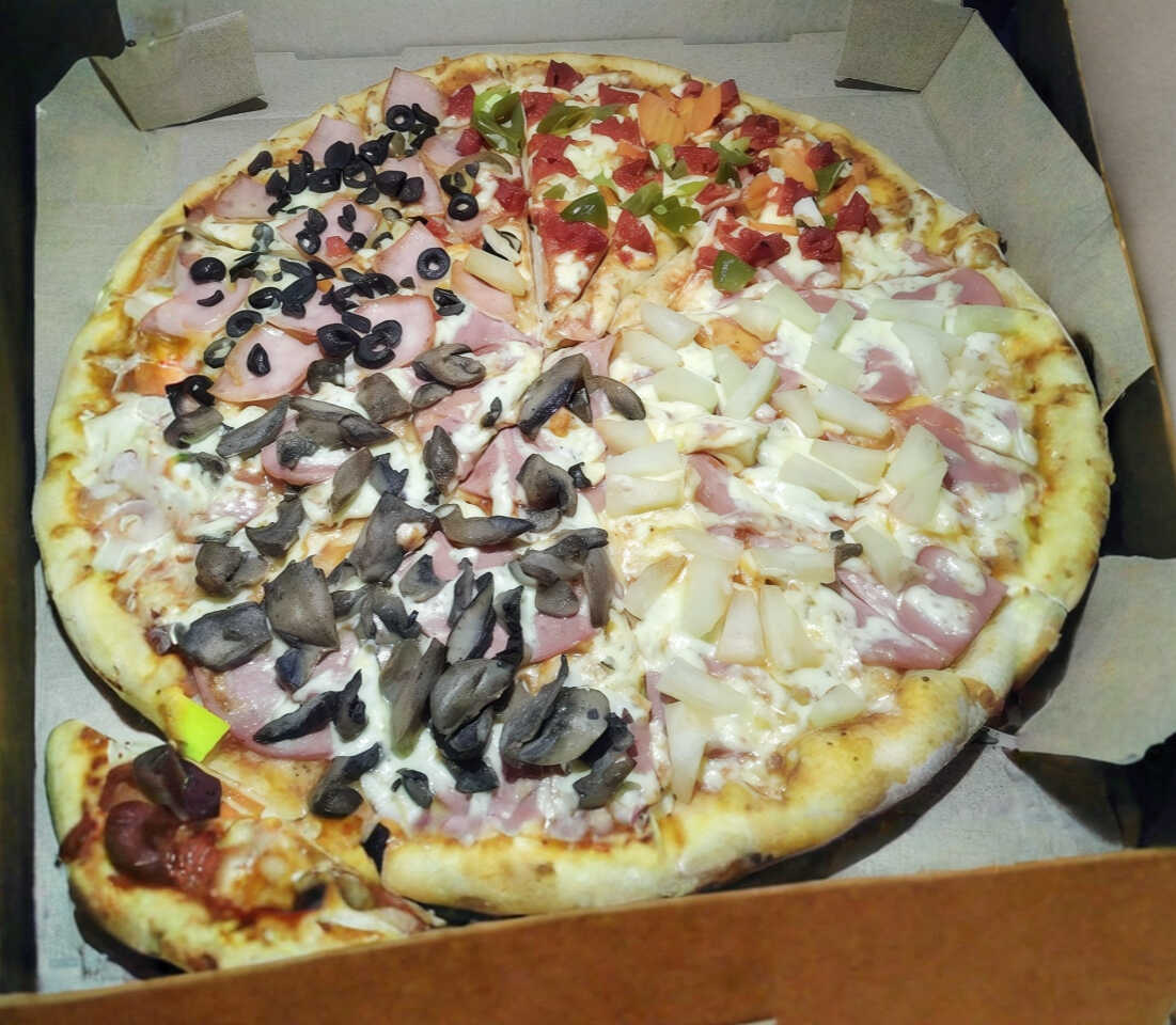 1/4 jalapeño y chorizo,1/4 jamón y piña ,1/4 salami y champiñón ,1/4 tocino y acecutunas
