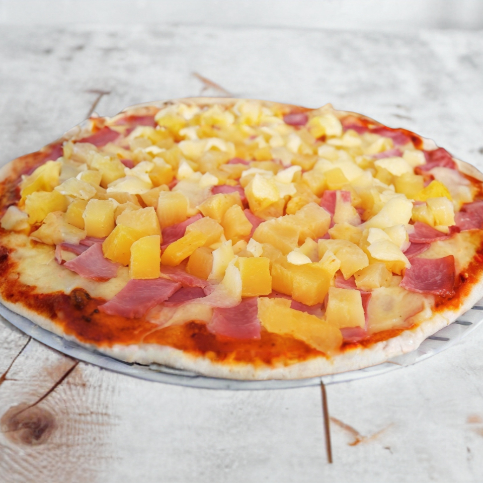 GRANDE 1/2 HAWAIANA Y 1/2 JAMÓN Y CHAMPIÑONES.