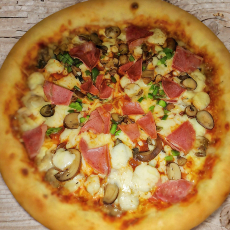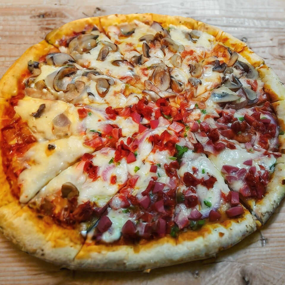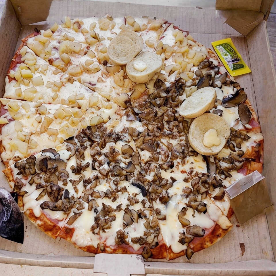 Mitad jamón y piña y mitad jamón y champiñones+ Incluye pan con ajo y queso grátis.
