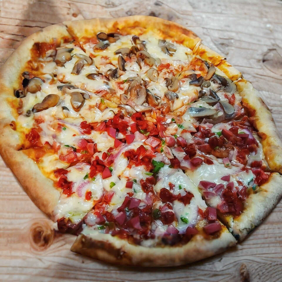 Jamón, queso, salami, champiñones, cebolla, pimiento, chorizo, champiñones.