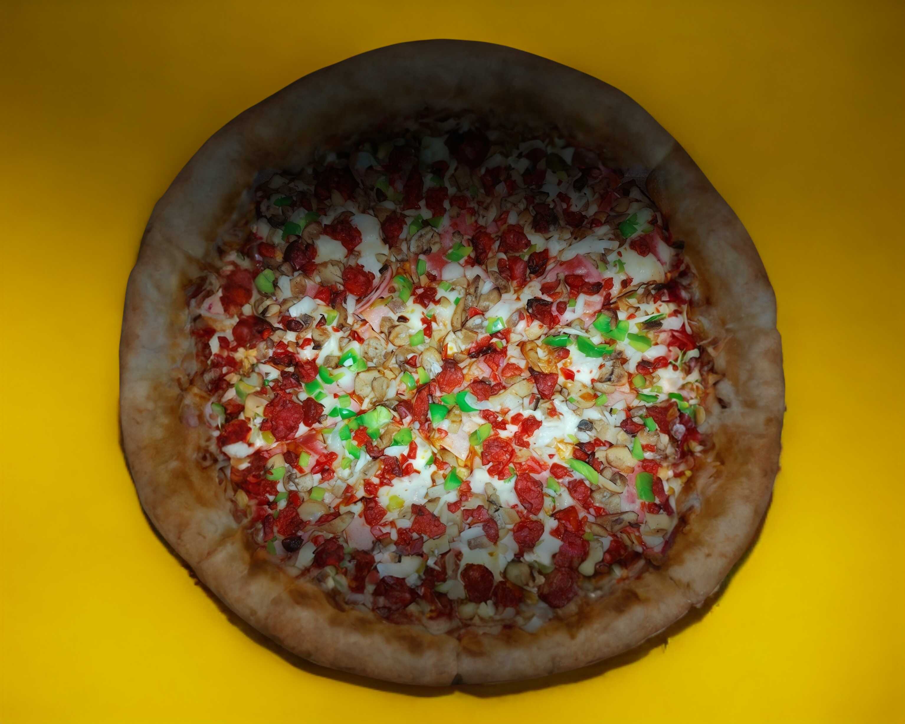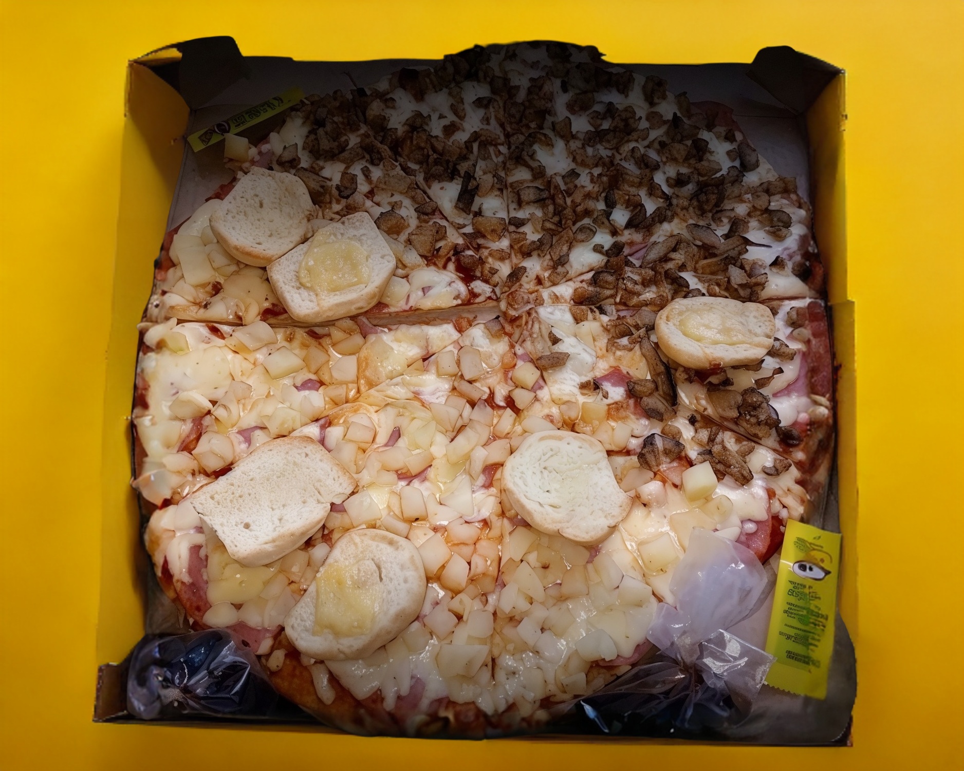 Jamón, salami, champiñones, cebolla, tocino, carne de pastor y pierna, pimiento, piña, queso más pan con ajo y queso.