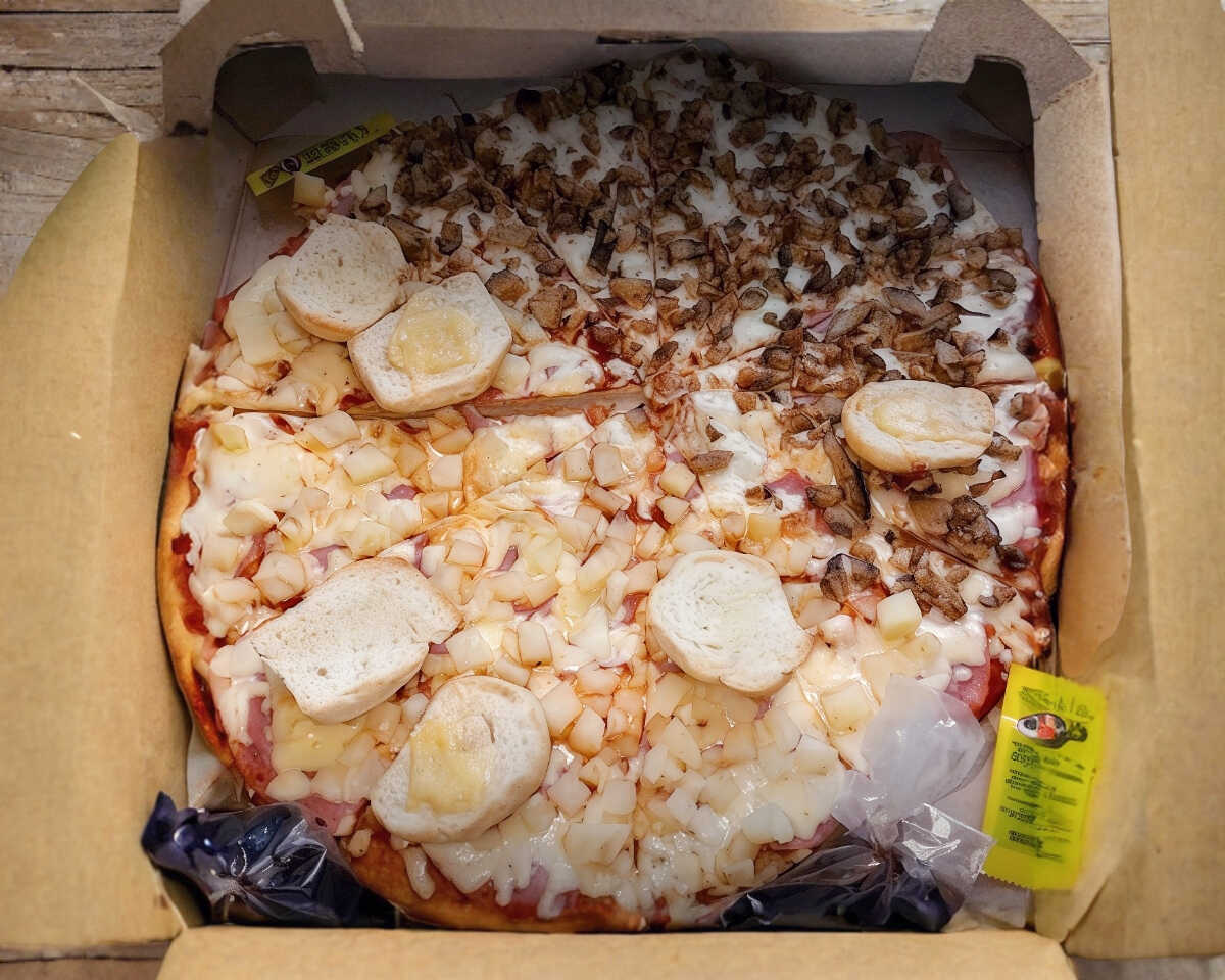 Jamón, salami, piña, cebolla, champiñón, pimiento y pan con ajo.