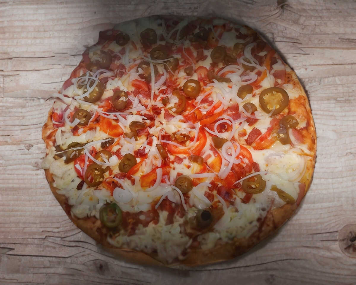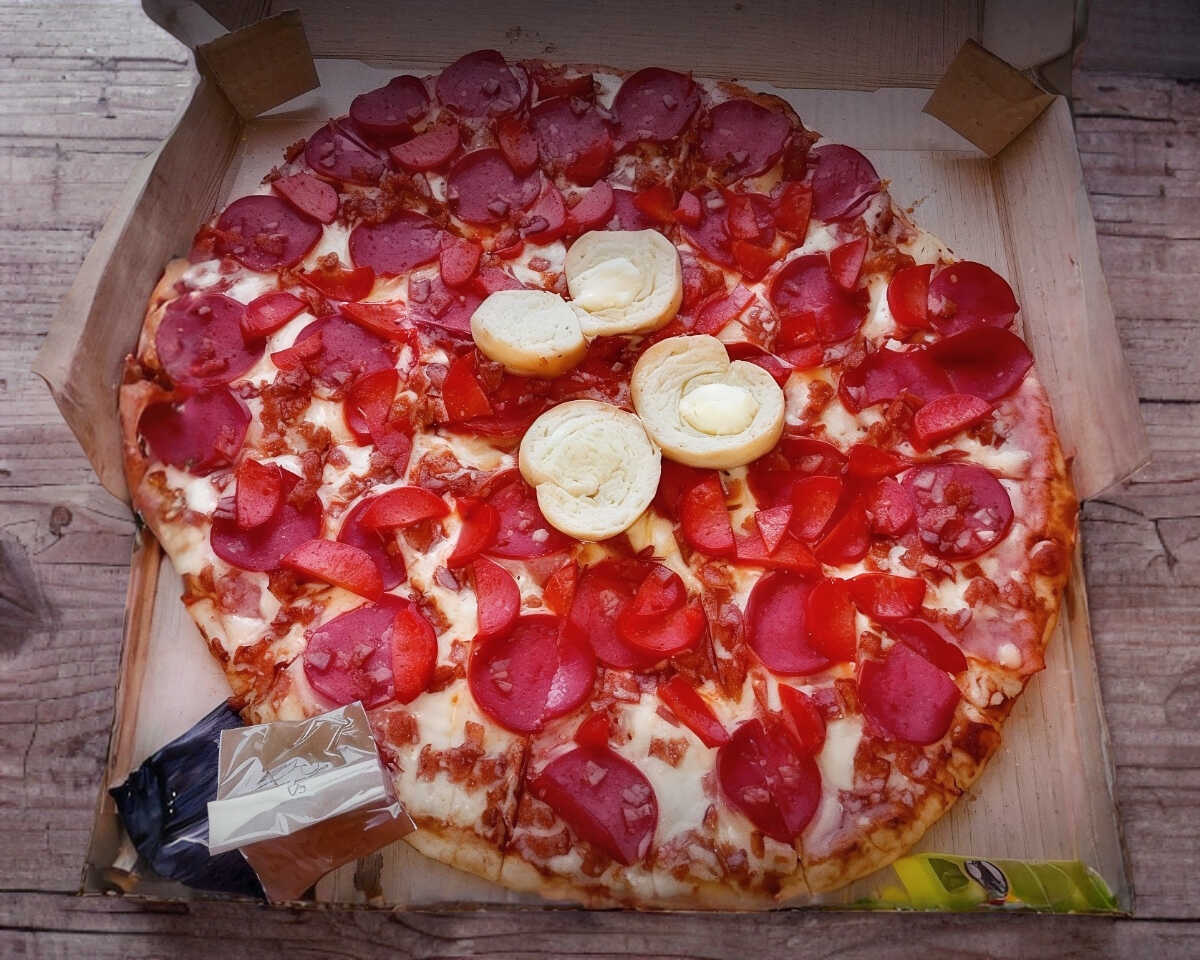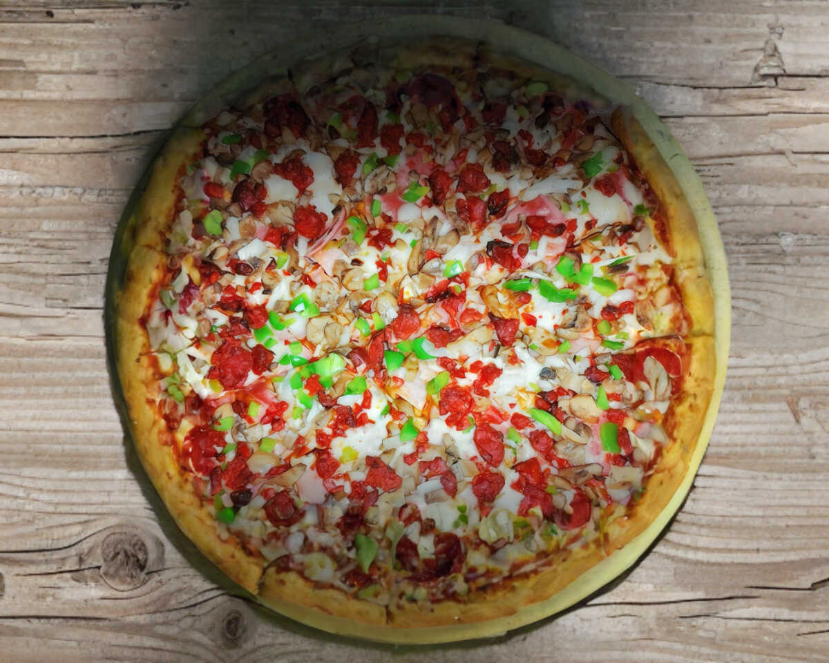 Jamón, queso, salami, champiñones, pimiento, cebolla, chorizo, pan de ajo y queso.