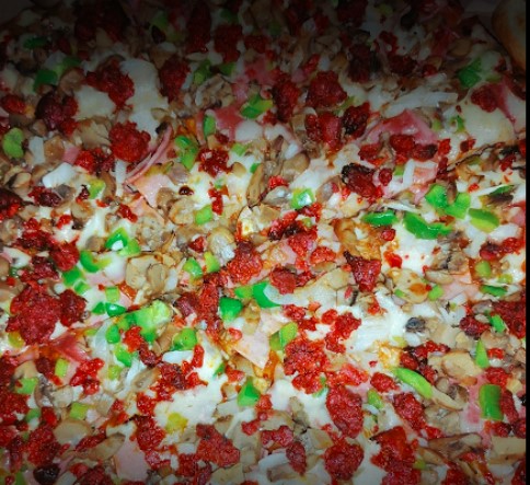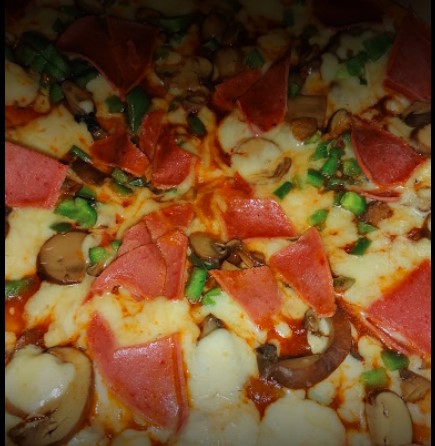 Jamón, queso, salami, champiñones, piña, Pierna, cebolla, pimiento, tocino y Pan de ajo y queso.