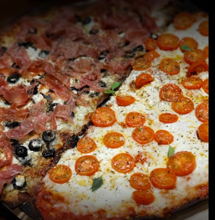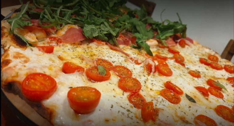 Contiene mitad Jamón, salami y mitad Jamón.Pan con ajo y queso grátis