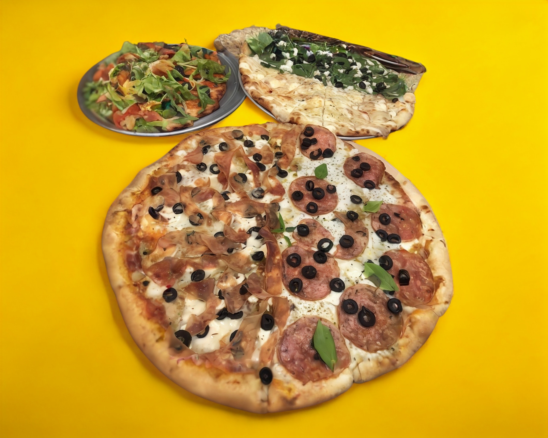 1 pizza de 3 ingredientes para escoger+ Pan con ajo y queso grátis.