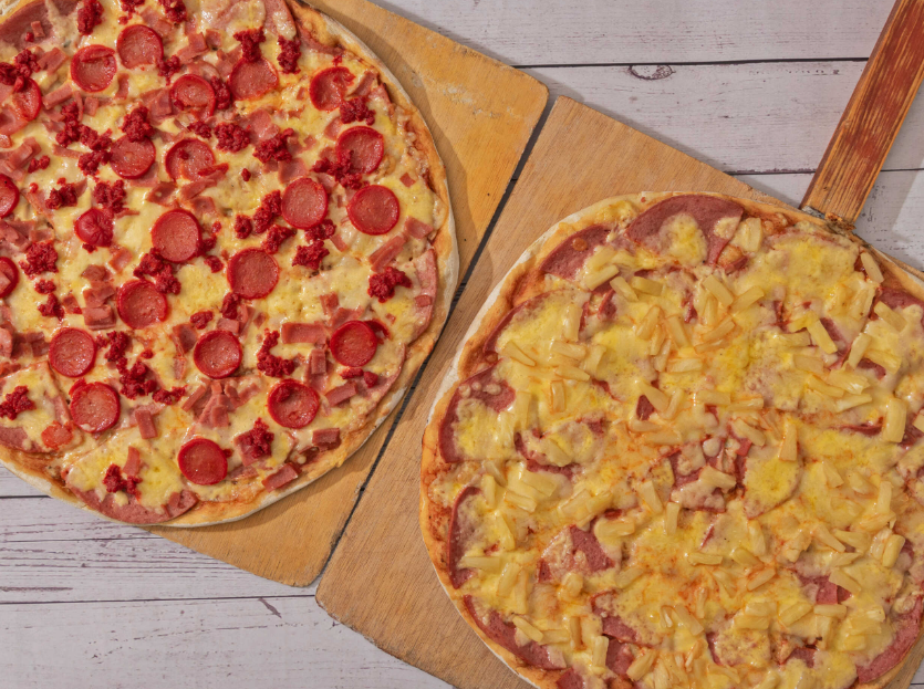 Pizza de jamón, queso, chorizo, tocino y salchicha asadera.