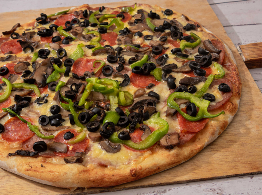 Pizza de jamón, salami, champiñón, piña, tocino, chorizo, salchicha, cebolla, pimiento y queso.