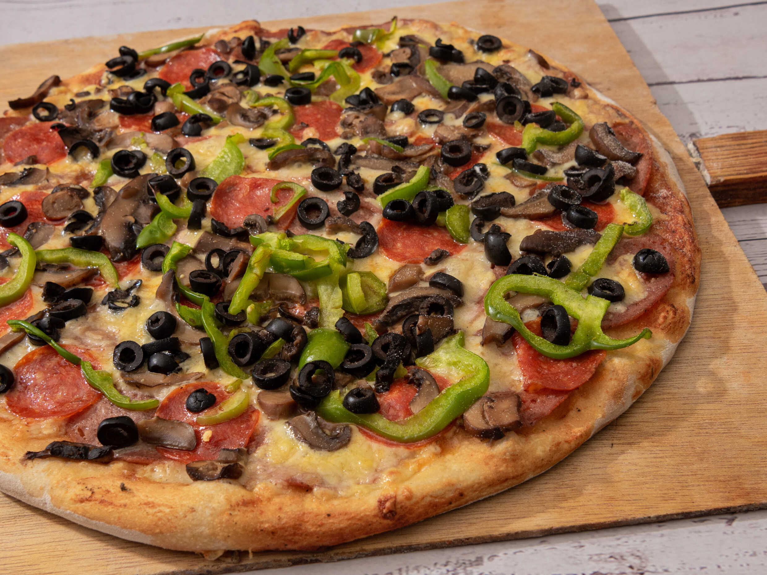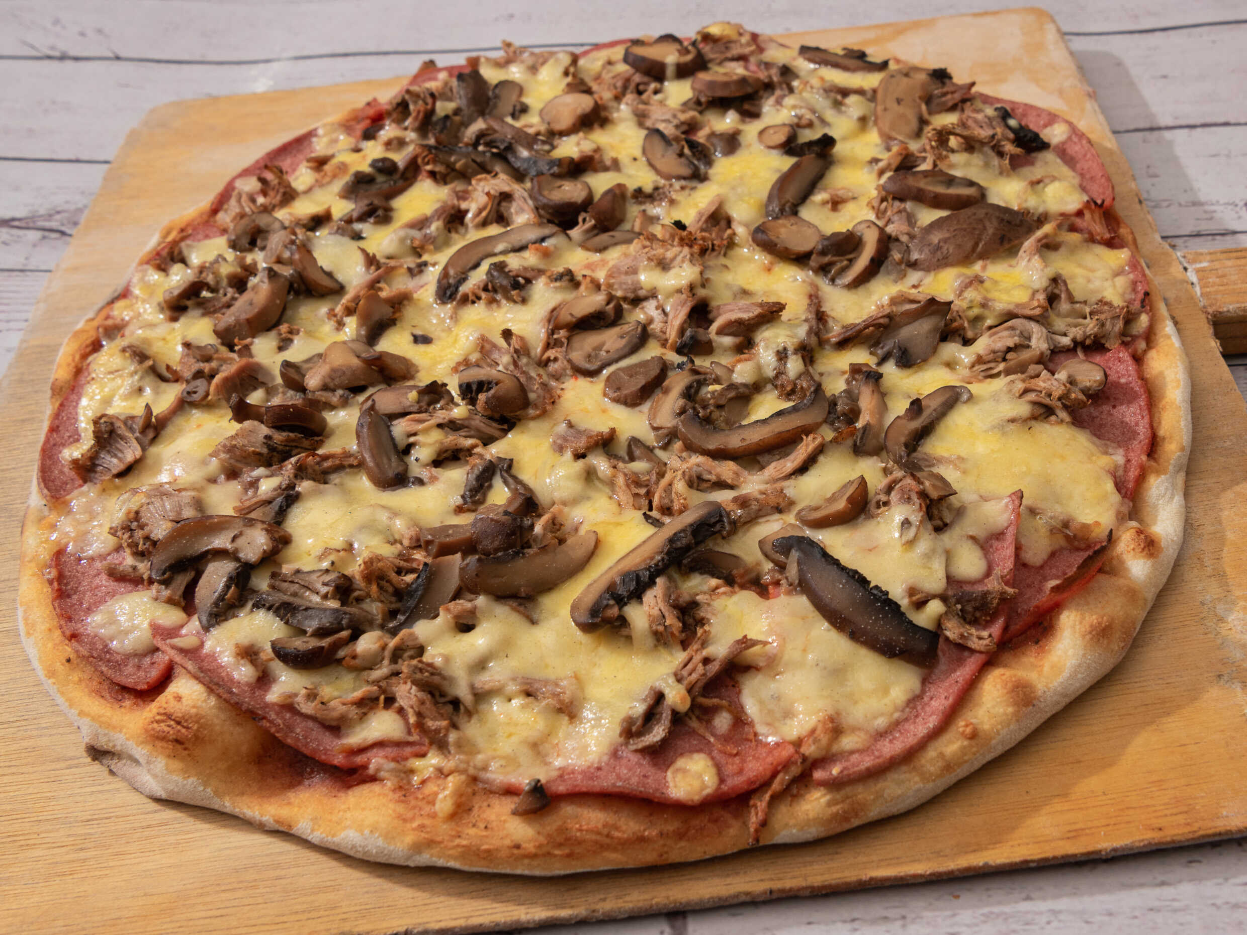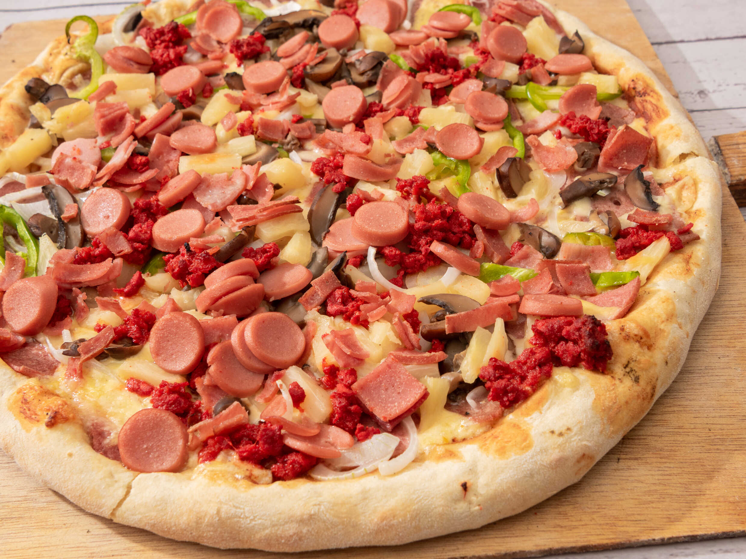 Pizza de jamon,salami,champiñon,piña,tocino,chorizo,salchicha,cebolla,pimiento y queso.