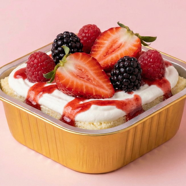 Fresco y vibrante, base de vainilla mojada en tres leches, cubierta con crema chantilly, fresas frescas, mix de frutos del bosque y con jarabe de fresa.
