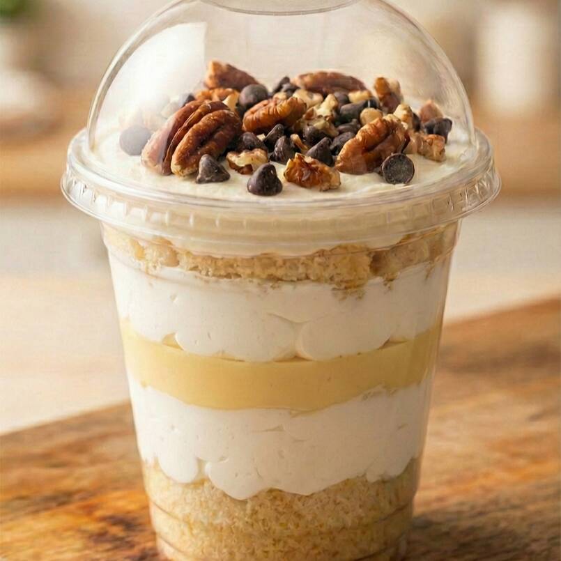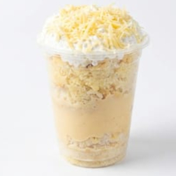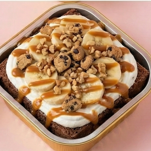 "Un antojo reconfortante y dulce. base de chocolate tres leches con crema chantilly, cubierta con rodajas de plátano fresco. lo elevamos con jarabe de cajeta, nuez troceada y trocitos de galleta de chispas para un final crujiente."