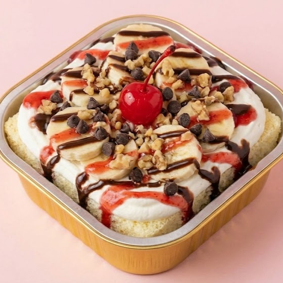 ¡El postre clásico de heladería hecho tres leches! base de vainilla bañada en tres leches, cubierto con crema chantilly, rodajas de plátano fresco, una cereza en almíbar en el centro, chocolate muibon , nuez picada espolvoreada , bañada con jarabe de fresa y chocolate.