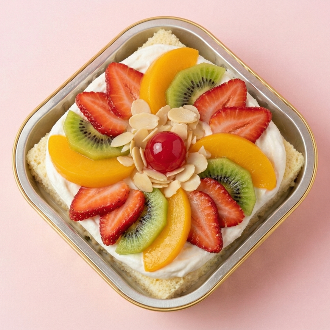 "¡Una fiesta de colores y sabor! base de vainilla tres leches con crema chantilly, cargada con un mix frutal de durazno, kiwi y fresa. decorado con almendra fileteada y una cereza brillante en el tope. fresco y cremoso."