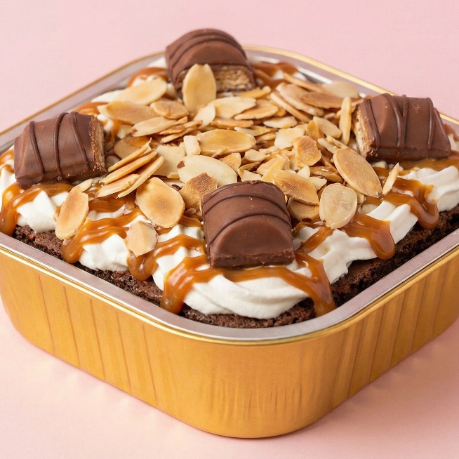 Dulzura al máximo, base de chocolate tres leches, cubiertos con chantilly , almendra fileteada tostada, trozos de chocolate muibon y jarabe de cajeta.