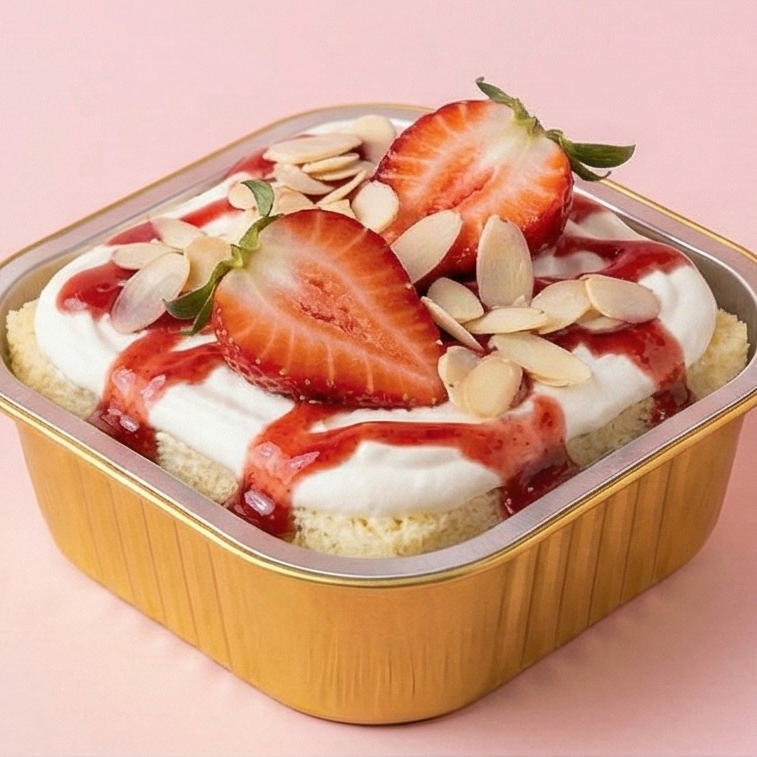 Una combinación ligera y deliciosa, base de vainilla bañada en tres leches, cubierta con crema chantilly, decorada con fresas frescas rebanadas y almendra fileteada para un toque crujiente, adicionalmente un generoso chorro de jarabe de fresa.