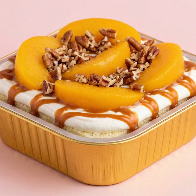 La combinación que nunca falla, base de vainilla mojada en tres leches, cubierta con chantilly, rebanadas de durazno, nuez picada y bañada en jarabe de cajeta.