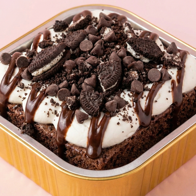 El sueño de los chocolateros, base de chocolate mojada en tres leches, cubierta con crema chantilly, trozos crujientes de galleta oreo y jarabe de chocolate intenso.