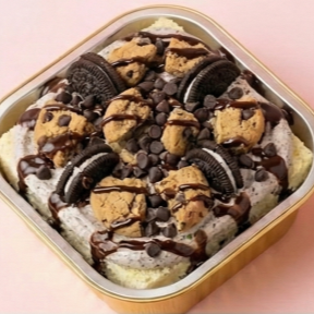 "¡Dos mundos deliciosos en uno! base de vainilla tres leches cubierta con suave crema chantilly; el toque estrella: una mezcla crujiente de galletas de chispas y trozos de oreo, finalizado con jarabe de chocolate