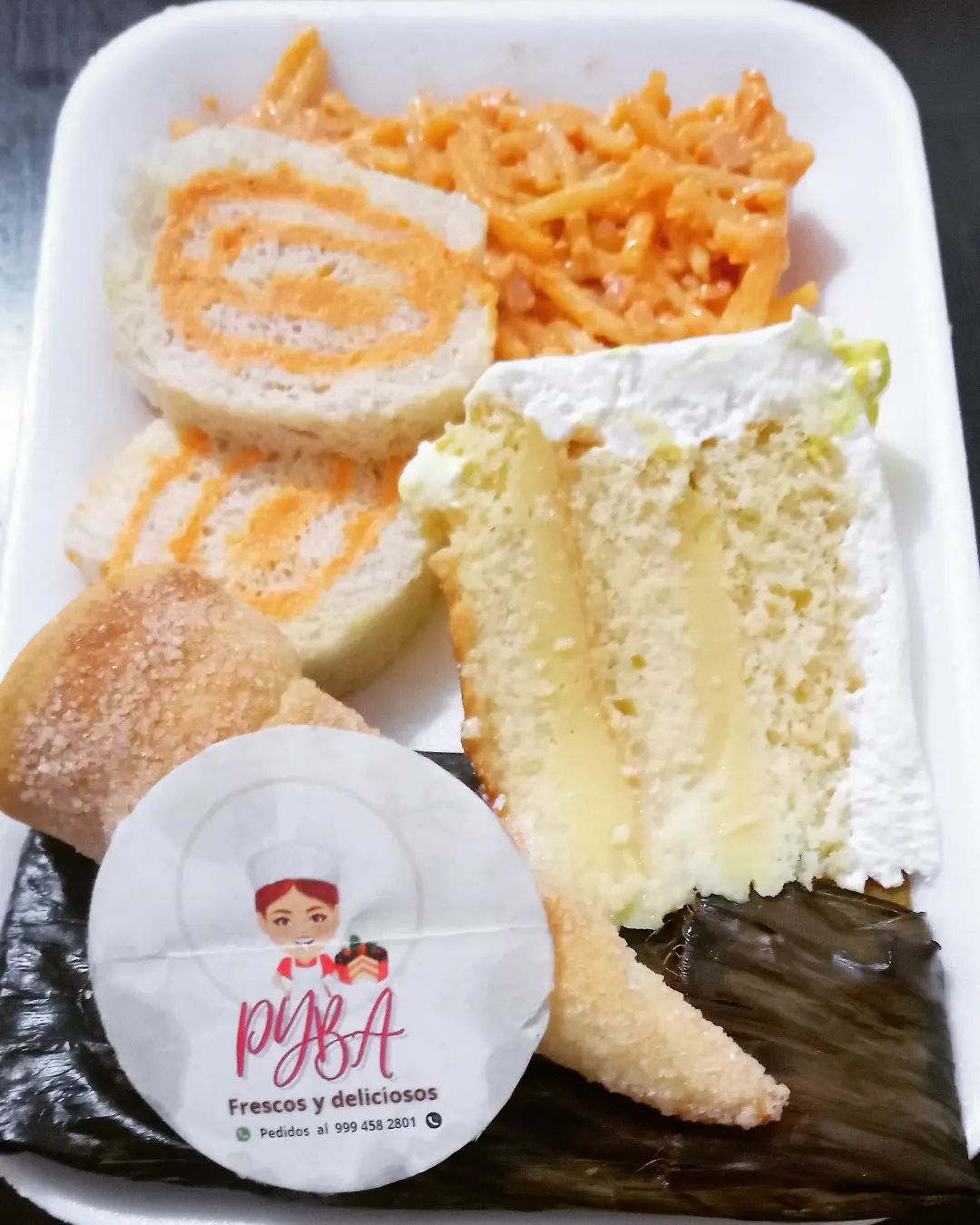2 Arrolladitos, cono relleno de carne molida, espagueti rojo, ensalada rusa y pastel de 3 leches.