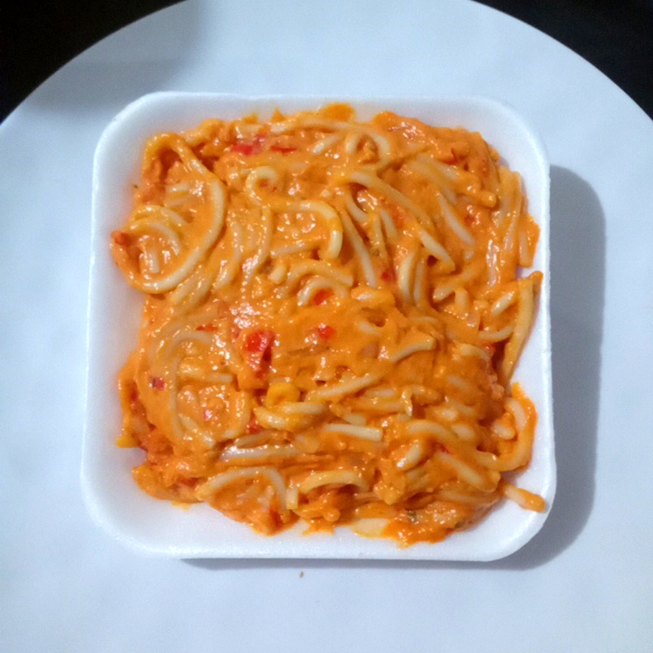 Espagueti rojo servido en plato de unicel cuadrado