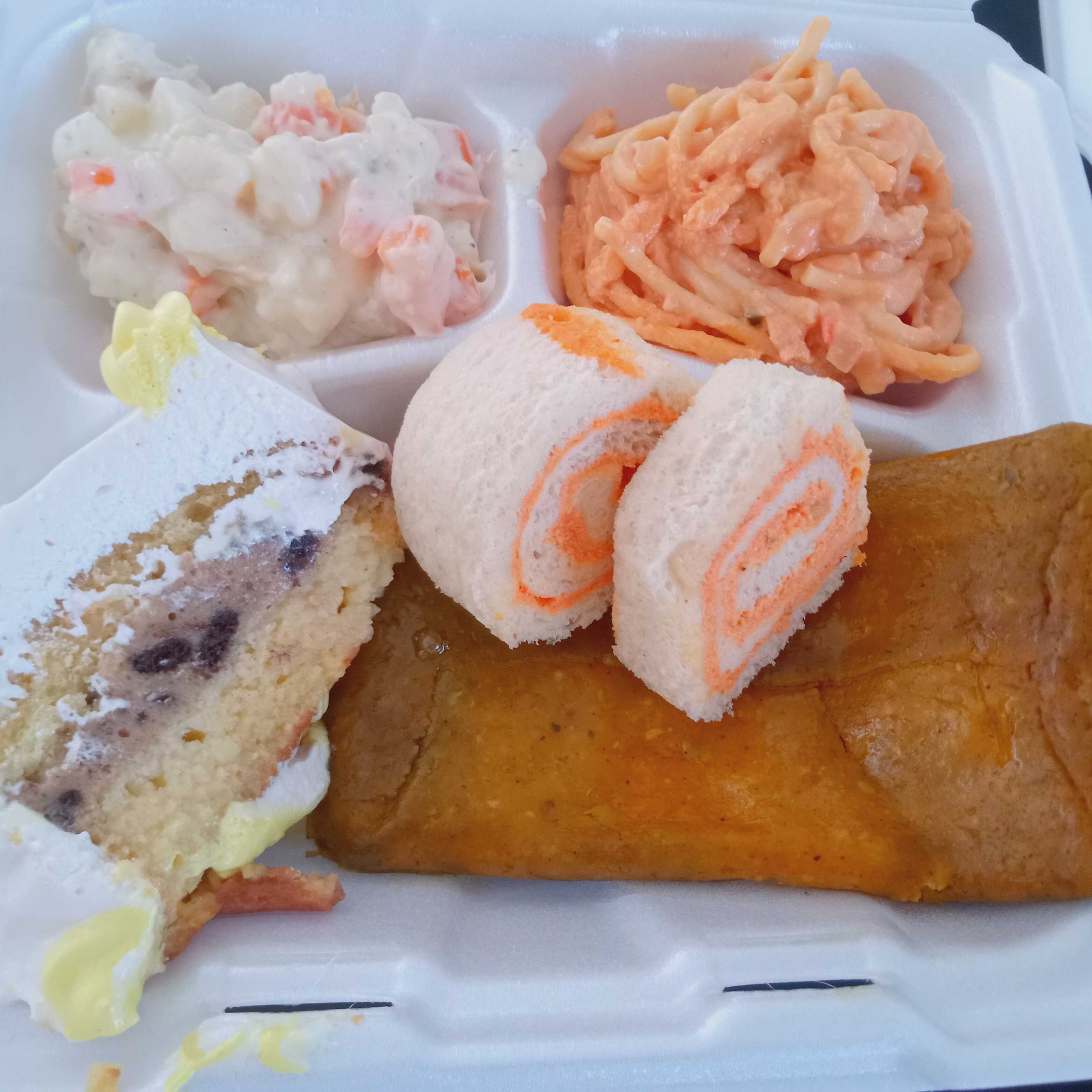 2 Arrolladitos, cono relleno de carne molida, espagueti rojo y pastel de 3 leches.