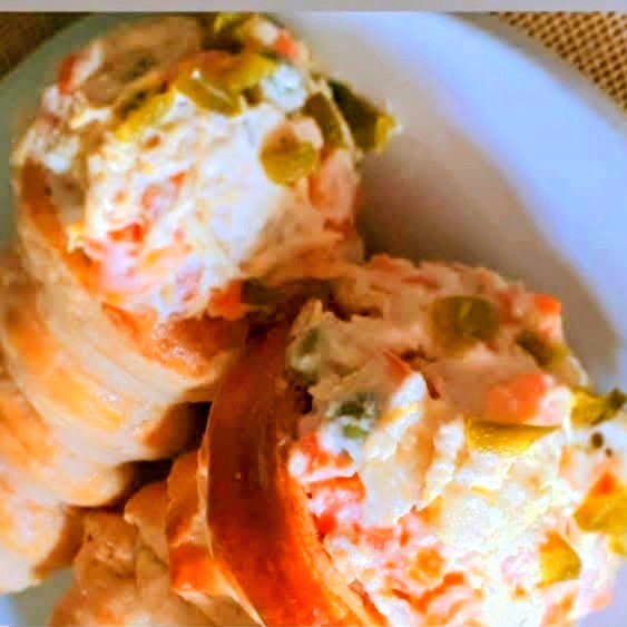 Tortita rellena de Pollo, Queso, cebolla curtida ymantequilla/mayonesa