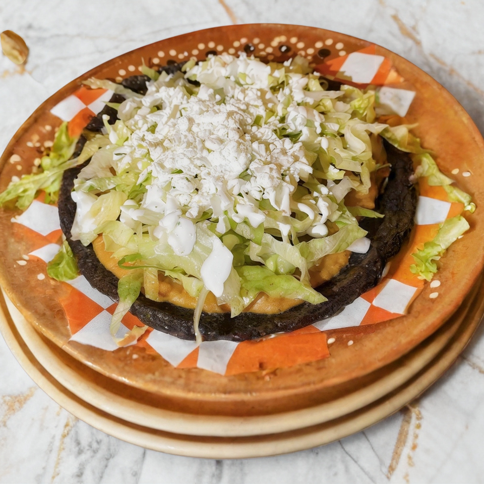 Masa en forma de huarache, en base de frijol, queso, crema cebolla y lechuga.